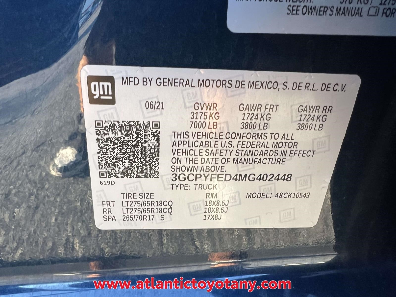 Subject to the primary lender's approval. All prices exclude tax, title, dealer fee of $695, tags, license & DMV. Vehicles are sold cosmetically as is. Not all cars are certified where as many do pass the certification process, the customer does have the right to add an optional extended service agreement. 2021 Chevrolet Silverado 1500 LT Trail Boss CLEAN VEHICLE HISTORY...NO ACCIDENTS, ONE OWNER, Multimedia Package, Silverado 1500 LT Trail Boss, 4D Crew Cab, EcoTec3 5.3L V8, 10-Speed Automatic, 4WD, Northsky Blue Metallic, Black Cloth, 10-Way Power Driver Seat w/Lumbar, 12-Volt Rear Auxiliary Power Outlet, 170 Amp Alternator, 2 USB Ports (First Row), 3.23 Rear Axle Ratio, 4-Wheel Disc Brakes, 4.2 Diagonal Color Display Driver Info Center, 4 Black Round Assist Steps (LPO), 4G LTE Wi-Fi Hot Spot Capable, 6-Speaker Audio System, ABS brakes, Air Conditioning, All-Weather Floor Liner (LPO) (AAK), AM/FM radio: SiriusXM, Apple CarPlay/Android Auto, Auto-Locking Rear Differential, Automatic temperature control, Auxiliary External Transmission Oil Cooler, Bed Protection Package, Black Name Plates (LPO), Black Tailgate CHEVROLET Lettering (LPO), Bluetooth® For Phone, Brake assist, Chevrolet Connected Access Capable, Chevytec Spray-On Black Bedliner, Cloth Rear Seat w/Storage Package, Cloth Seat Trim, Color-Keyed Carpeting Floor Covering, Compass, Convenience Package w/Buckets Seats, Dark Essentials Package (LPO), Deep-Tinted Glass, Delay-off headlights, Driver door bin, Driver vanity mirror, Dual Exhaust w/Polished Outlets, Dual front impact airbags, Dual front side impact airbags, Dual-Zone Automatic Climate Control, Electric Rear-Window Defogger, Electrical Lock Control Steering Column, Electronic Cruise Control, Electronic Stability Control, EZ Lift Power Lock & Release Tailgate, Floor Mounted Center Console, Front anti-roll bar, Front Bucket Seats, Front Center Armrest w/Storage, Front dual zone A/C, Front fog lights, Front LED Fog Lamps, Front License Plate Kit, Front reading lights, Front wheel independent suspension, Fully automatic headlights, Heated door mirrors, Heated Driver & Front Outboard Passenger Seats, Heated front seats, Heated Steering Wheel, Heated steering wheel, Heavy-Duty Air Filter, High Gloss Black Grille, High Gloss Black Mirror Caps, Hill Descent Control, Hitch Guidance, Illuminated entry, Keyless Open & Start, Leather Wrapped Steering Wheel, LED Cargo Area Lighting, LED Reflector Headlamps, Low tire pressure warning, Manual Tilt/Telescoping Steering Column, Not Equipped w/Automatic Stop/Start, Occupant sensing airbag, Off-Road Suspension w/2 Lift, OnStar & Chevrolet Connected Services Capable, Outside temperature display, Overhead airbag, Overhead console, Panic alarm, Passenger door bin, Passenger vanity mirror, Performance Red Recovery Hooks, Power Door Locks, Power door mirrors, Power driver seat, Power Front Windows w/Driver Express Up/Down, Power Front Windows w/Passenger Express Down, Power Rear Windows w/Express Down, Power steering, Power windows, Preferred Equipment Group 2LT, Premium audio system: Chevrolet Infotainment 3, Radio data system, Radio: Chevrolet Infotainment 3 System, Rear Dual USB Charging-Only Ports, Rear reading lights, Rear seat center armrest, Rear step bumper, Rear Vision Camera, Rear Wheelhouse Liners, Rear window defroster, Remote keyless entry, Remote Vehicle Starter System, Security system, SiriusXM Radio, Speed control, Speed-sensing steering, Split folding rear seat, Standard Tailgate, Steering Wheel Audio Controls, Steering wheel mounted audio controls, Suspension Package, Tachometer, Telescoping steering wheel, Theft Deterrent System (Unauthorized Entry), Tilt steering wheel, Traction control, Trailering Package, Trip computer, Variably intermittent wipers, Voltmeter, Wheels: 18 x 8.5 Black Painted Aluminum. 4WD 10-Speed Automatic EcoTec3 5.3L V8 Odometer is 11289 miles below market average! Price subject to change Subject to primary lenders a